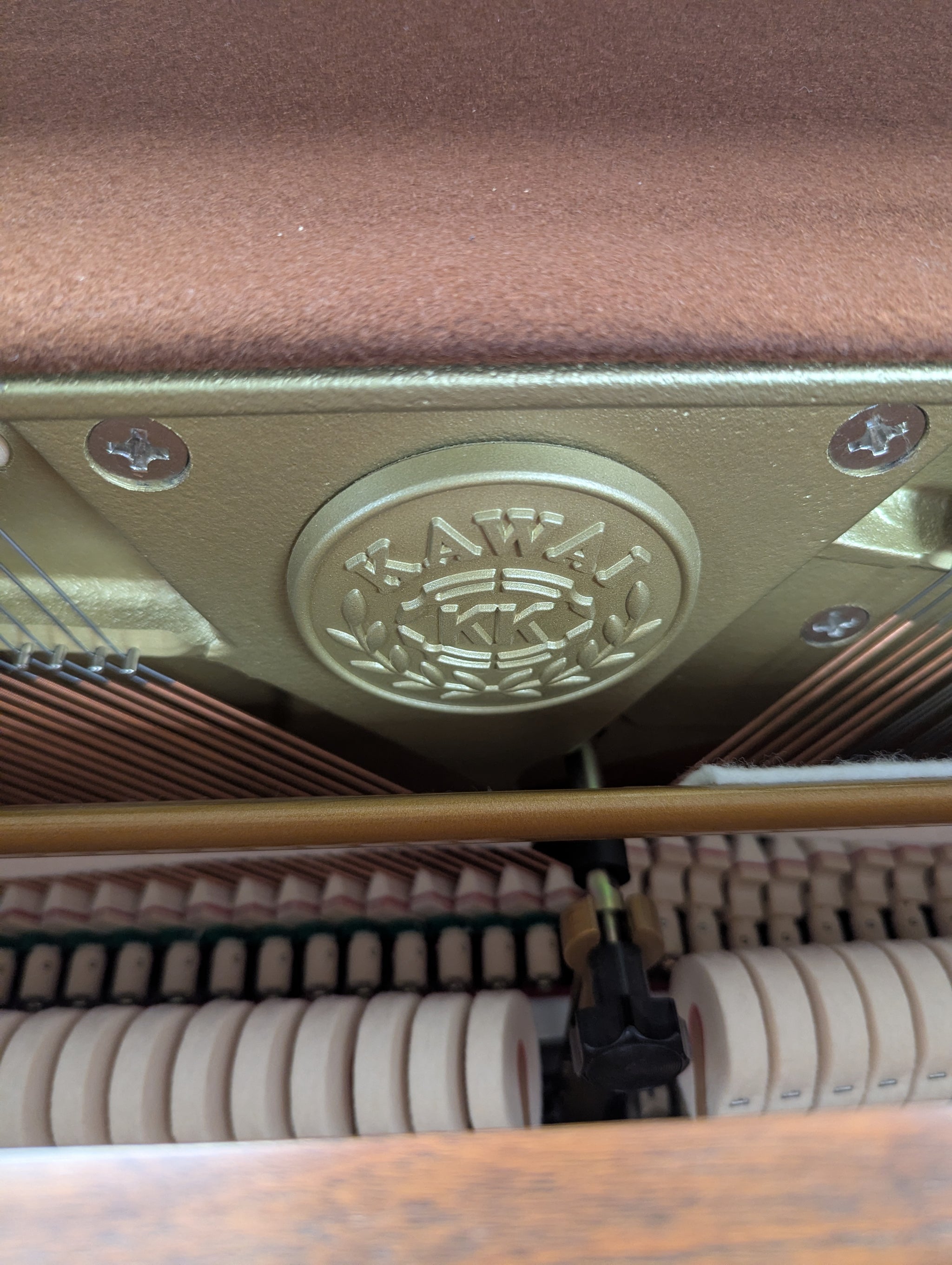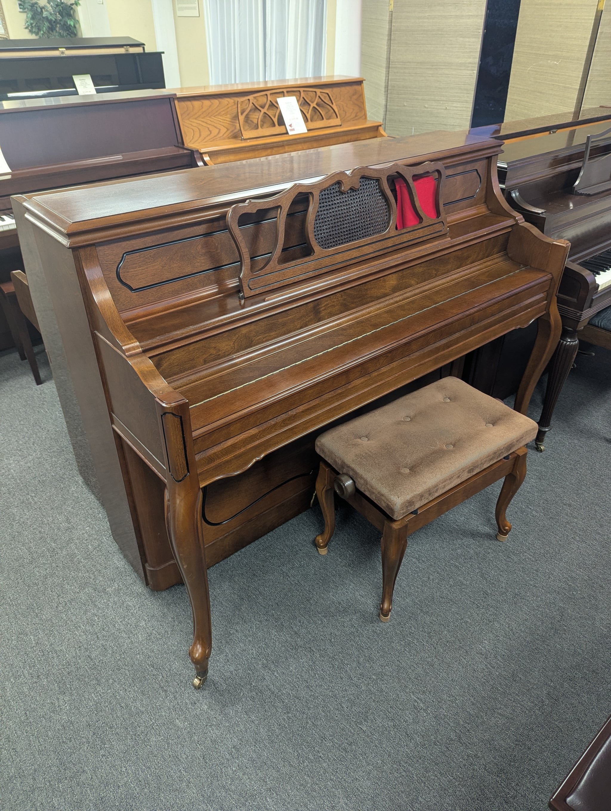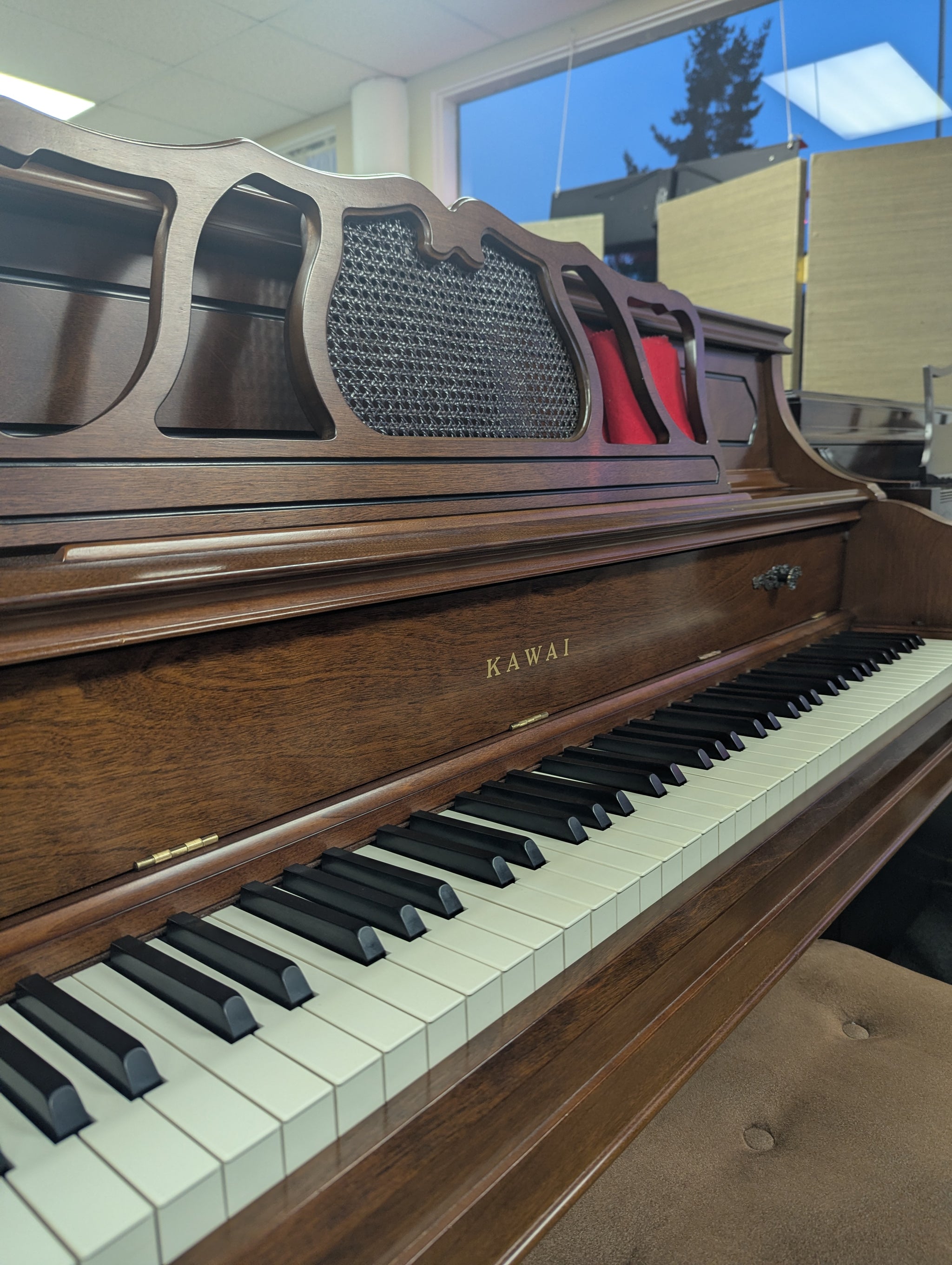 Built in Japan! Walnut satin finish. Excellent starter piano for the budding pianist. Nice touch and tone, so the pianist will develop good playing skills. Beautiful intricate cabinet design!